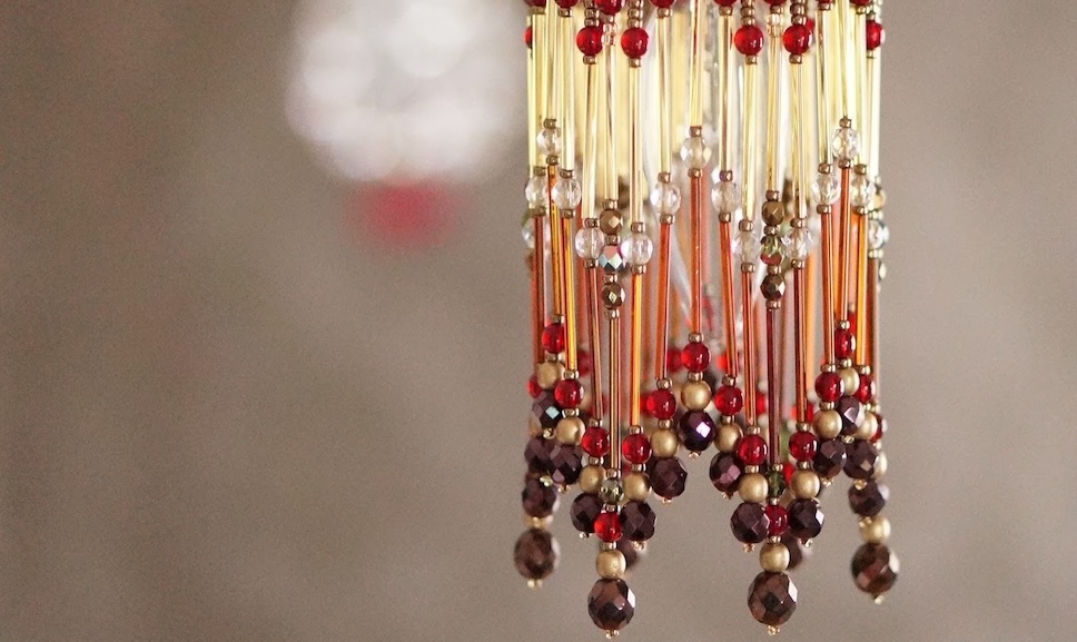 ナッツブラウン*裾レッドは、非常に特別なデザインであり、ビーズの配色が印象的です。このバランスの取れた色合いは、どんな部屋にもマッチし、視覚的な美しさを提供します。特にお祝いの場面にぴったりです。